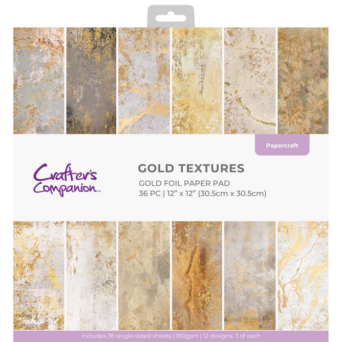 Scrapbookové čtvrtky se zajímavým potiskem (textury kamene, mramoru), každý arch je zdobený luxusní zlatou fólií - ke zdobení scrapbookových stránek, přáníček apod. 36 archů (3 x 12 různých designů). Gramáž: 180 g/m2. Velikost: 30,5 x 30,5 cm.