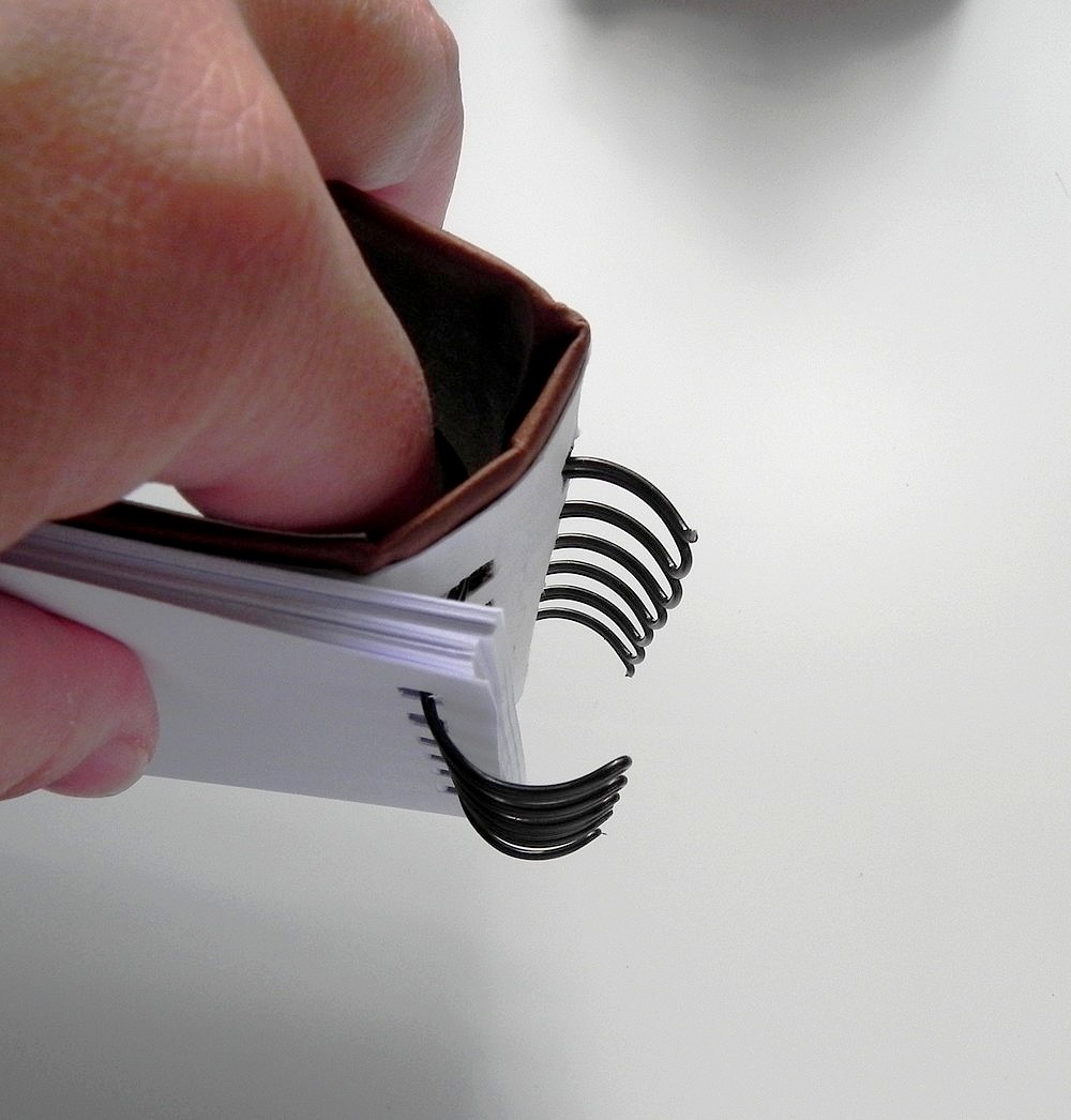 Pozn.: Zkoušela jsem desky dělat i ze tří oddělených dílů. Sice se pak desky lépe ohýbají, ale papír je v tom místě i mnohem více namáhán a trhá se (pokud to není diář ve vintage stylu, kde je tento efekt vítanou realistickou ozdobou, je to chyba) . Navíc, problém nastává v konečné fázi „secvaknutí", kdy se kroužky nedovřou do kulatého tvaru.