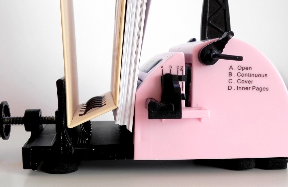 Pak diář rozevřu tak, že lícové strany desek jsou u sebe, vložím do strojku na kroužkovou vazbu a kroužky uzavřu.