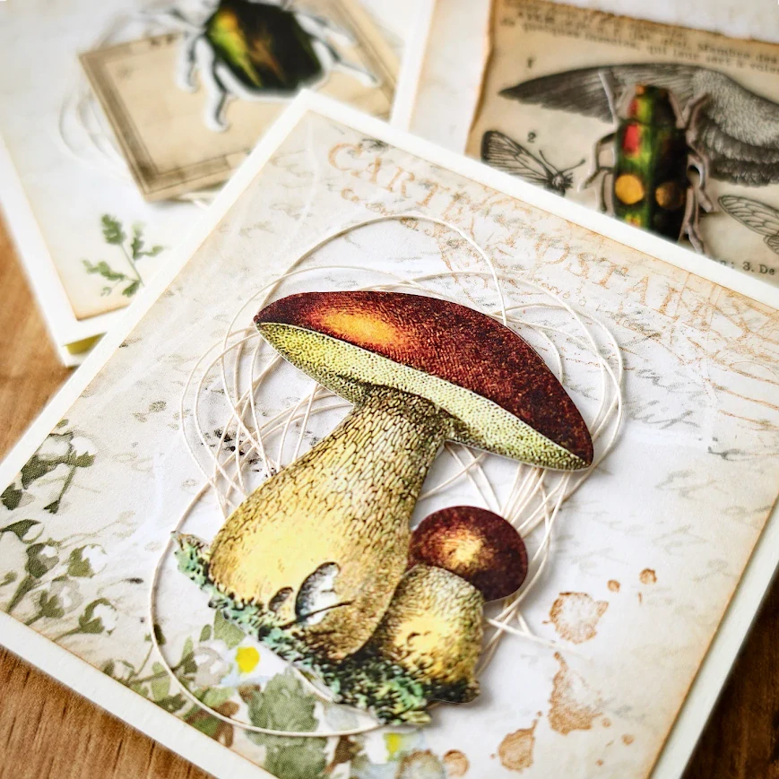 Bloček zdobí detailní ilustrace hub v herbářovém stylu s vintage patinou starých časů. Najdete na nich jemné popisky, štítky i zašlé tisky inspirované historickými přírodovědnými zápisy. Každý papírový bloček působí jako stránka vytržená ze starého herbáře nebo deníku přírodovědce.