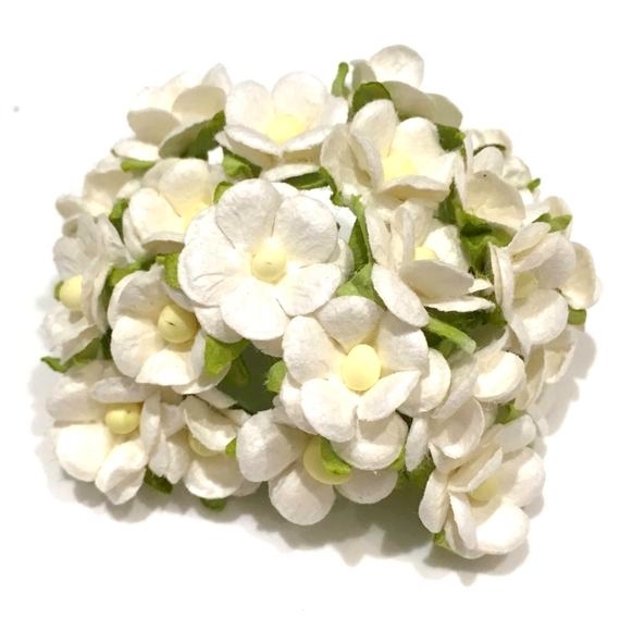 Papírové kytičky - SWEETHEART BLOSSOMS / WHITE WITH LEAVES 15 mm (10 ks)
