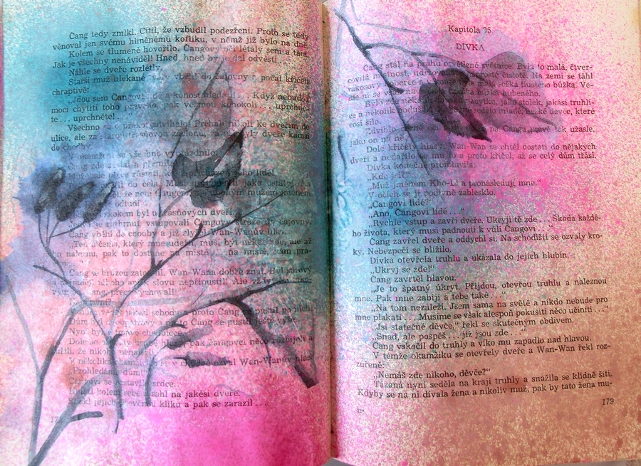 Protože tématem kurzu byla výroba ART JOURNALU, holky si přivezly starší knihy, které si pod vedením Helge a Pampelíny dotvořily k obrazu svému. Některé kousky byly opravdu unikátní - např. stará sběratelská encyklopedie, kterou v antikvariátu ukořistila Anička, ta byla skvělá a jemné dotvoření její krásu ještě více podtrhlo. Během těchto dvou workshopů se holky naučily pracovat s gessem, strukturovací pastou, využily masky a spreje, které našly ve svých uvítacích balíčcích, pohrály si s distress inkousty a ke slovu přišly i ubrousky a decoupage v netradičním pojetí.