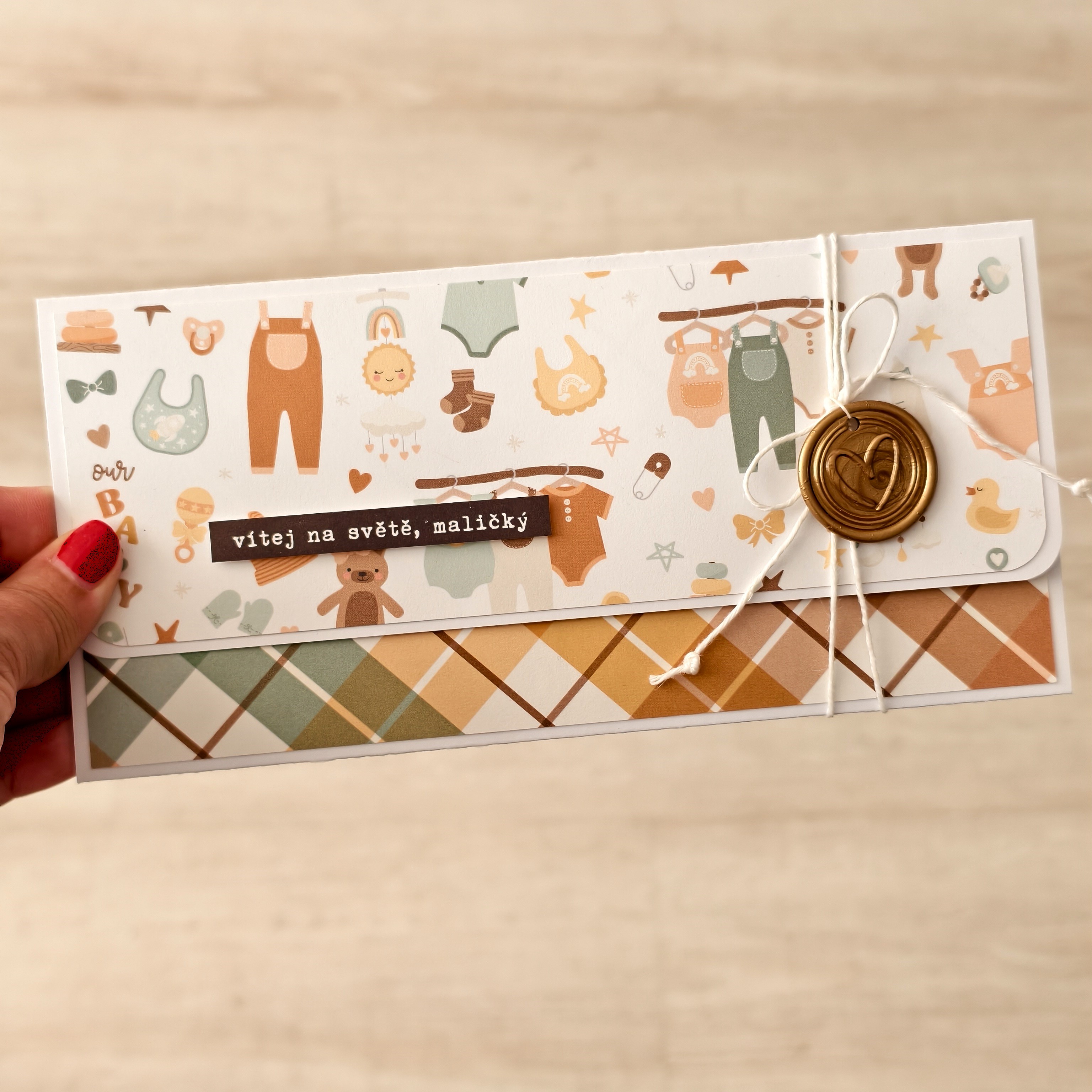S kapsou pro vložení hotovosti, poukazu nebo třeba jen kartičky se vzkazem. Součástí je kartička s nápisem "Vítáme tě na světě!"