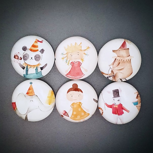 Originální ručně vyrobené magnetky z dílny Pretty Papers. Materiál: sklo, papír, feritový magnet. Velikost: 25 mm. 6 ks v sadě.
