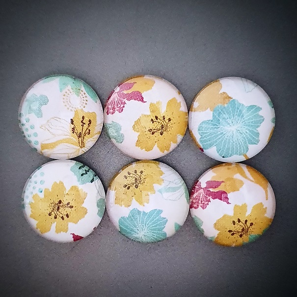 Originální ručně vyrobené magnetky z dílny Pretty Papers. Materiál: sklo, papír, feritový magnet. Velikost: 25 mm. 6 ks v sadě.