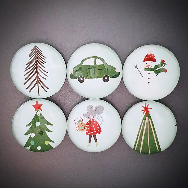 Originální ručně vyrobené magnetky z dílny Pretty Papers. Materiál: sklo, papír, feritový magnet. Velikost: 25 mm. 6 ks v sadě.