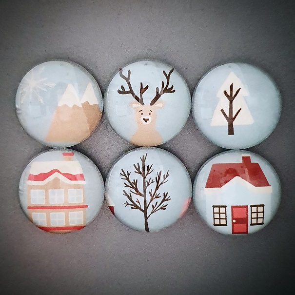 Originální ručně vyrobené magnetky z dílny Pretty Papers. Materiál: sklo, papír, feritový magnet. Velikost: 25 mm. 6 ks v sadě.