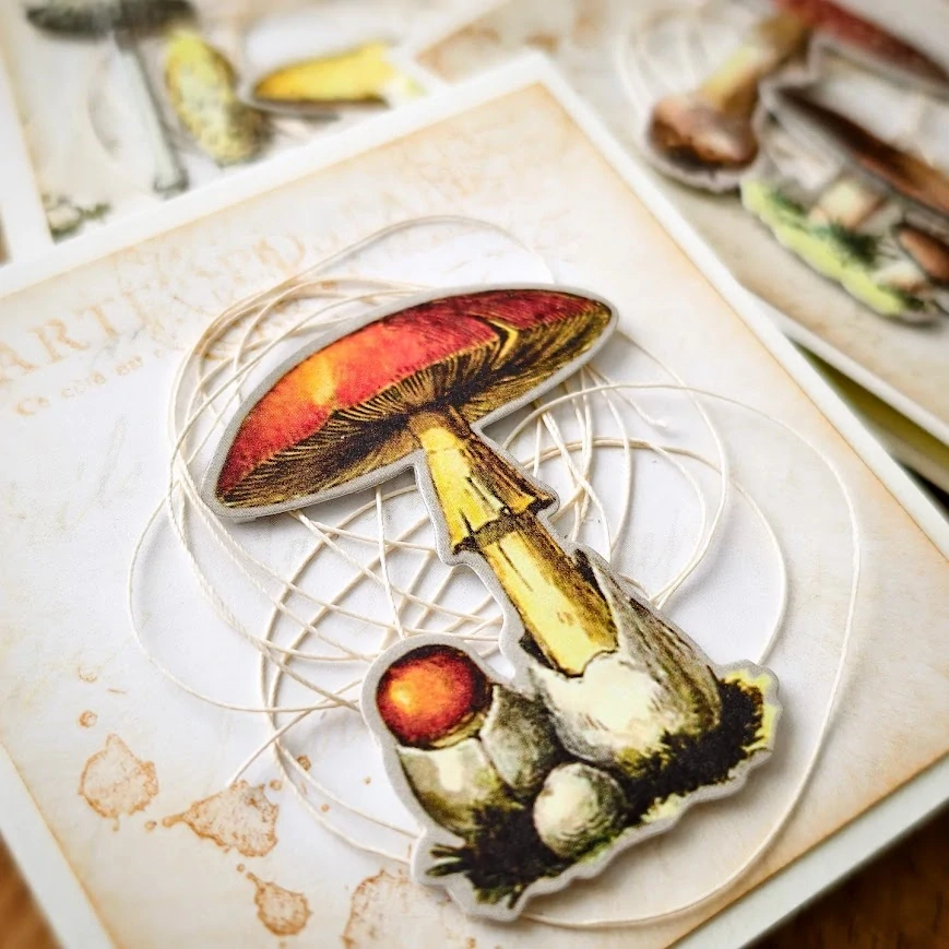 Bloček zdobí detailní ilustrace hub v herbářovém stylu s vintage patinou starých časů. Najdete na nich jemné popisky, štítky i zašlé tisky inspirované historickými přírodovědnými zápisy. Každý papírový bloček působí jako stránka vytržená ze starého herbáře nebo deníku přírodovědce.