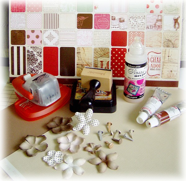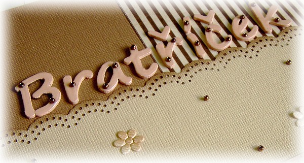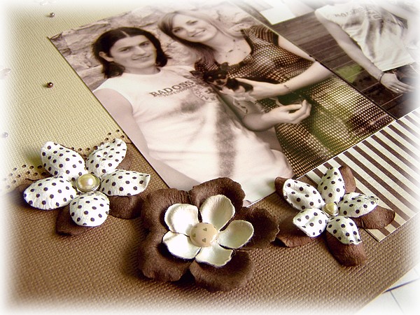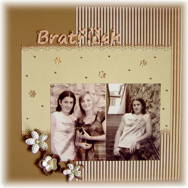 Už delší dobu jsem si chtěla vytvořit stránku s fotkami, na kterých jsem se svým bratrem, a které byly focené pro naši mamku před několika lety. Tyto fotky se i pro čokoládové téma báječně hodily, protože jsem je měla uložené i v barvě sépie. Oboustrannou lepicí páskou jsem je přilepila na stránku přesně podle sketche. Na ozdobení jsem použila papírové kytičky v hnědých odstínech, které mám moc ráda, a kovové svorky.